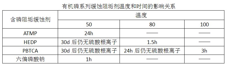 有機磷酸是指分子中的膦酸基團直接與碳原子相連的化合物。其中最常用的有ATMP(氨基三甲叉膦酸)、HEDP(羥基乙叉二膦酸)、EDTMPS(乙二胺四甲叉膦酸鈉)、PBTCA(2-膦酸丁烷-1,2,4-三羧酸)和HPA(羥基膦酰基乙酸)等,其中ATMP、HEDP和EDTMPS等這些為有機磷系列的緩蝕阻垢劑,他們通常與前面說的無機鹽(硫酸鋅等)等復(fù)合配伍,達到緩蝕阻垢劑的效果。由于循環(huán)冷卻水中有些水質(zhì)有較高的溫度,下面對ATMP、HEDP、PBTCA和六偏磷酸鈉的熱穩(wěn)定性做個簡要說明: