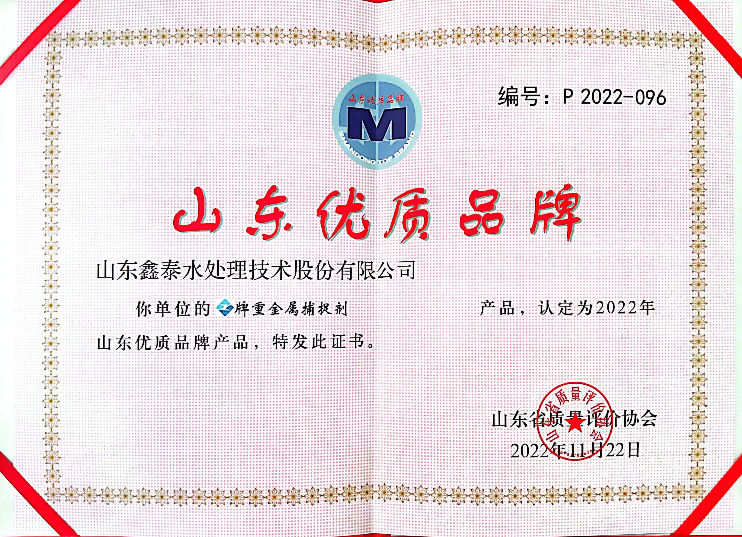 近日,山東省質量評價協(xié)會公布了2022年山東優(yōu)質品牌產品認定結果,山東鑫泰水處理技術股份有限公司生產產品“重金屬捕捉劑”入選“2022年山東優(yōu)質品牌產品”。